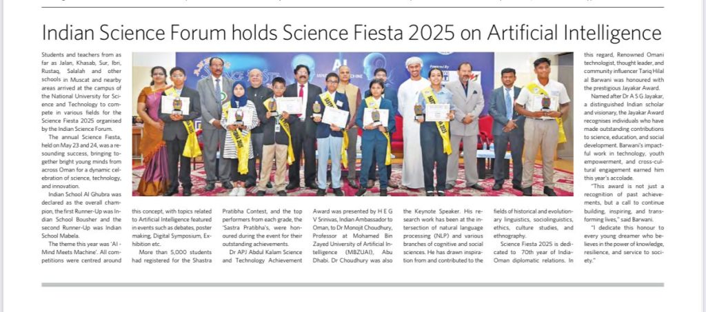 The Annual Science Fiesta 2025 successfully extended learning beyond the classroom, fostering critical thinking, effective communication, and a deeper understanding of science’s real-world applications, while also celebrating the robust relationship between Oman and India.
