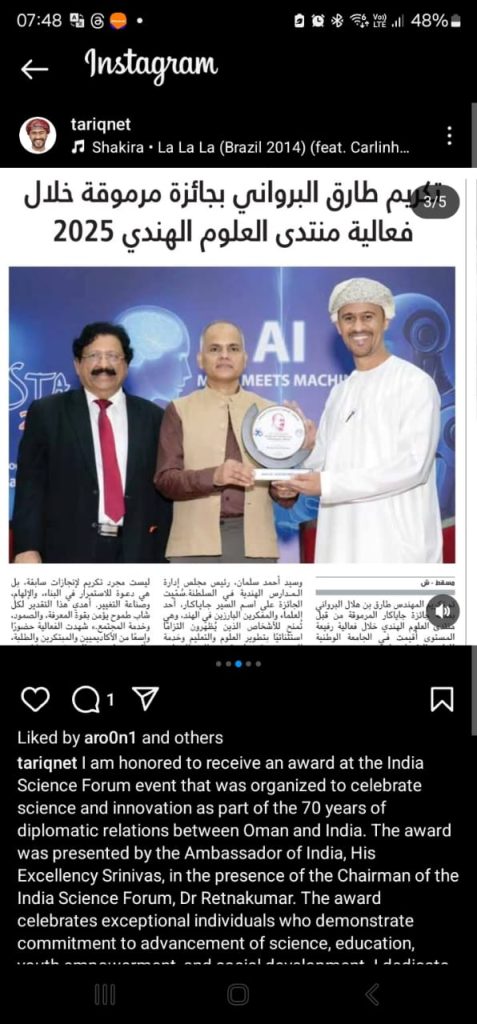 - Jayakar Award: In a special tribute to the 70th year of India–Oman diplomatic relations, renowned Omani technologist Tariq Hilal Al Barwani was honored with this prestigious award. Named after scholar Dr. A S G Jayakar, the award recognizes contributions to science, education, and social development. Al Barwani, lauded for his impactful work in technology and youth empowerment, said, “This award is not just a recognition of past achievements, but a call to continue building, inspiring, and transforming lives.” The award was presented by H.E. G V Srinivas, in the presence of Dr. J Retnakumar (Chairman, ISF), Kiran Asher, and Syed Ahmad Salman (Chairman, BoD Indian Schools).